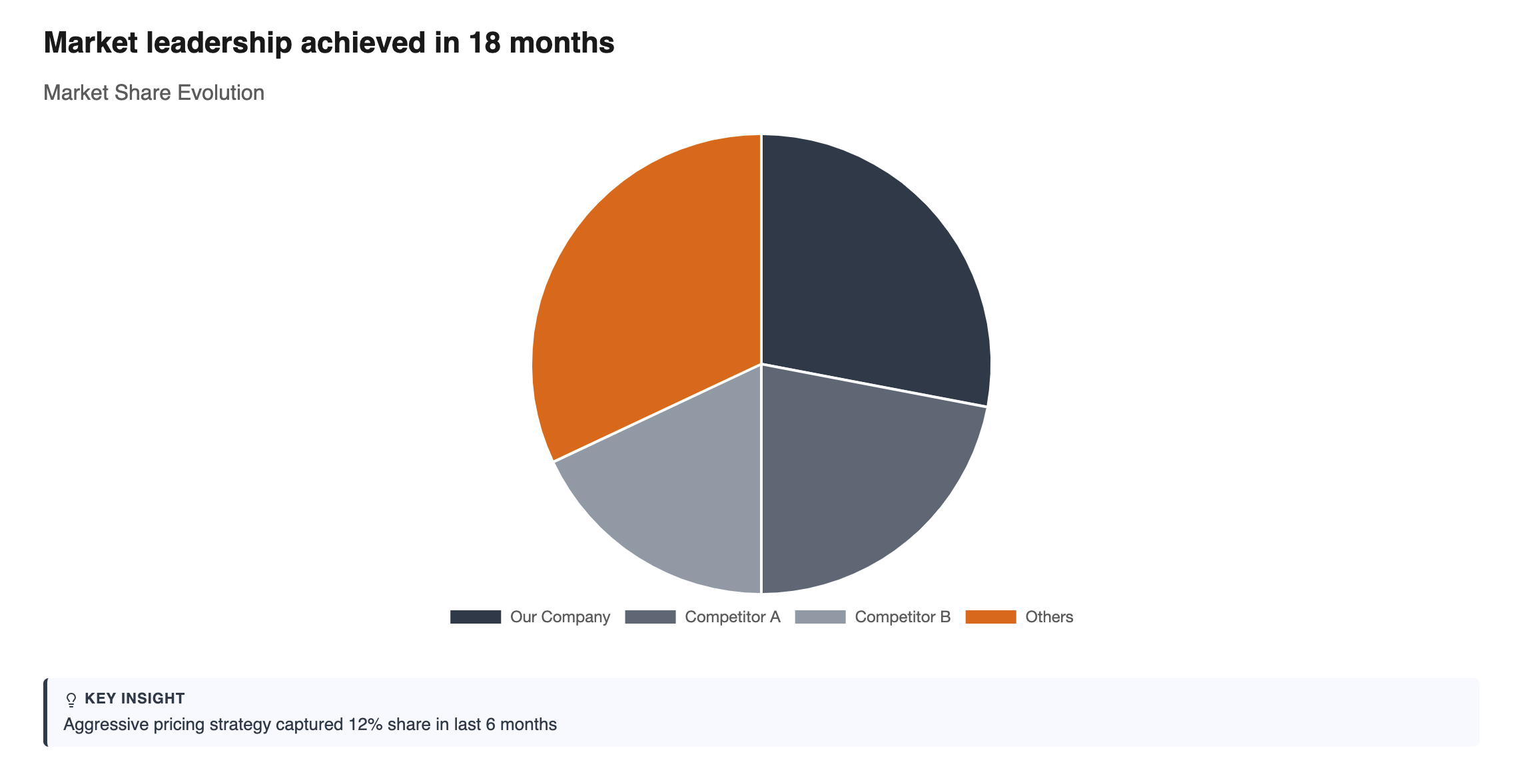 Während andere Tools reine Textausgaben liefern, erstellen wir interaktive Diagramme und professionelle Visualisierungen. Statt ChatGPT-ähnlicher Auflistungen erhältst du Chart.js-basierte MBB-Style Slides mit echten Datenvisualisierungen.
